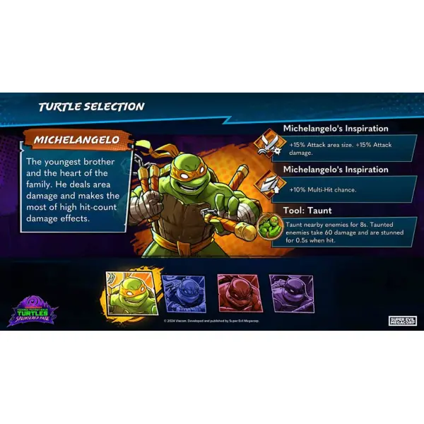 In Splintered Fate, brace yourself for fast-paced, roguelike action where no two runs are the same. With randomised power-ups, room layouts, and boss modifiers, the excitement never ends. Take control of all four Turtles, each wielding unique powers, and team up with friends for bodacious co-op gameplay. Explore iconic NYC locations, upgrade your Turtle powers, and prepare to face off against formidable enemies.